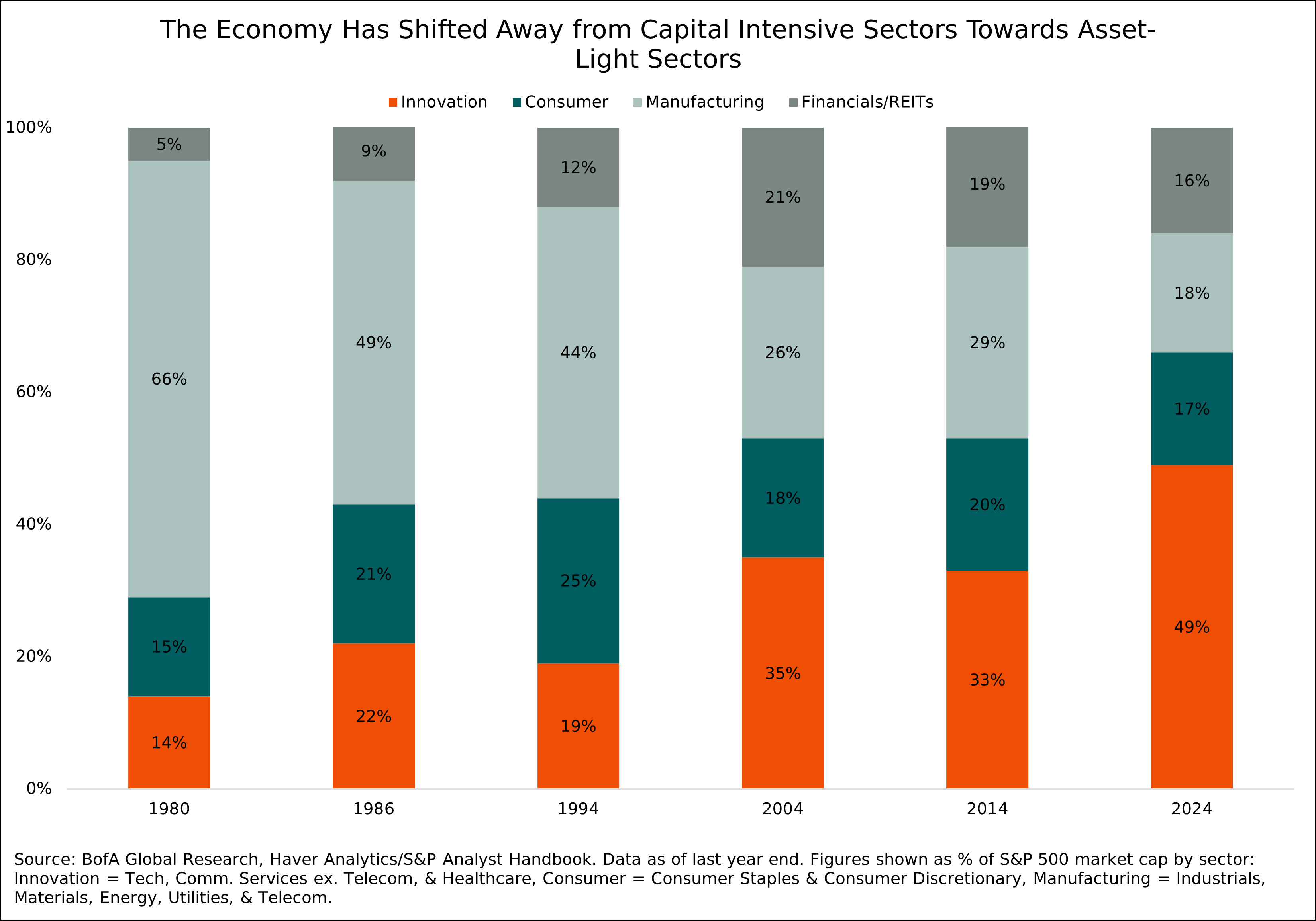 Today’s economy looks very different than past decades. Comparing today’s multiples to those of the 20th century without acknowledging this shift can be misleading. Back then, capital-intensive industries with lower margins and higher reinvestment needs dominated the market. Now, as shown in the chart below, technology and service-oriented companies, which scale efficiently, require less capital, and earn higher margins, represent a much larger share of the S&P 500. In 1980, capital-intensive businesses made up two-thirds of the index, while asset-light firms were less than 15%. Today, roughly half of the index is represented by innovation-driven companies, while manufacturing has shrunk below 20%. Naturally, investors should apply different multiples to cyclical, capital-intensive firms versus high-margin, scalable businesses.