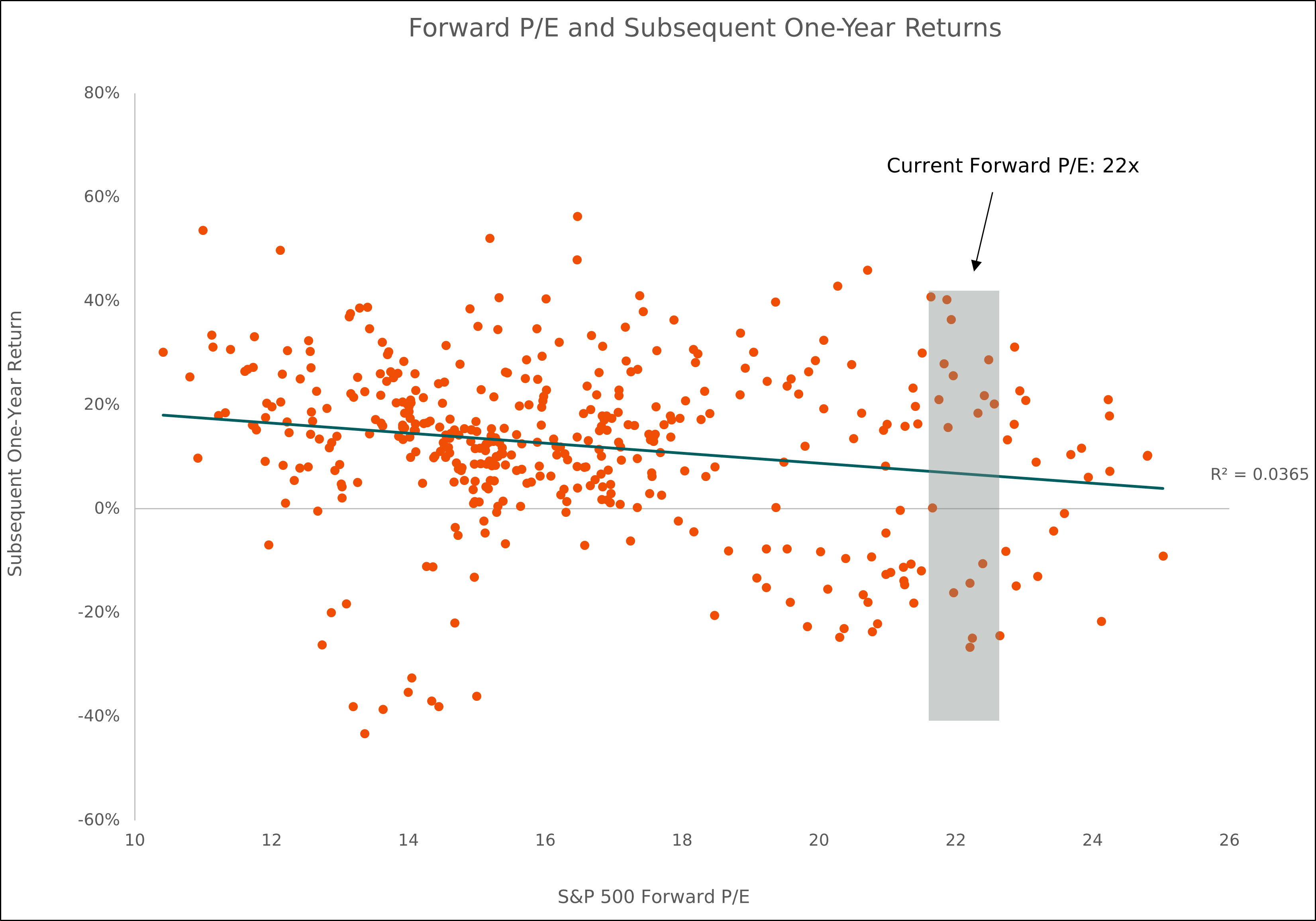 Today, valuations are at about 22x forward earnings, which is high relative to history. When we look at past periods (shown in the gray shaded bar in the chart below), subsequent 12-month returns following similar valuation levels have been extremely wide, ranging from significant losses to strong gains. This wide dispersion highlights that while valuations can inform long-term expected returns, they are a poor tool for short-term market timing. Other factors such as earnings growth expectations, monetary policy, and investor sentiment tend to play a much larger role in driving market performance over a one-year horizon.