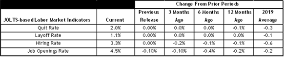 Since April, job gains averaged around 53,000 per month, which aligns closely with estimates of breakeven job levels needed to keep unemployment steady. We are not yet seeing broad-based layoffs or the kind of deterioration that typically signals an outright downturn. In the table below, we show some current key labor market stats compared to prior periods.
