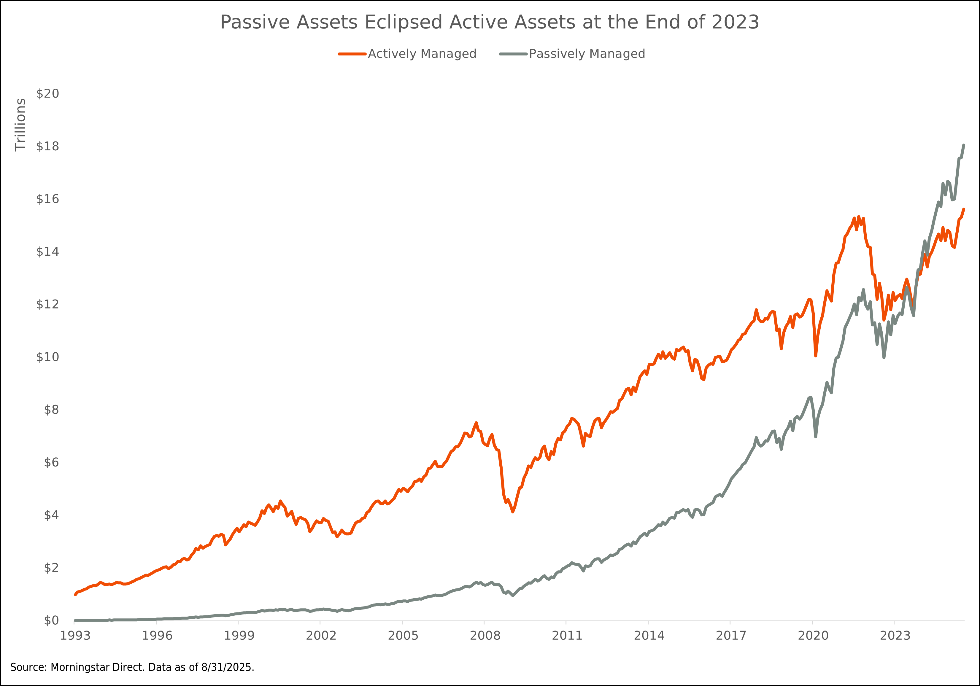 Beyond sector composition, structural shifts in market dynamics are also at play. The rise of passive investing has fundamentally altered flows into equities. With defined contribution plans replacing defined benefit pensions, most workers invest steadily into markets regardless of valuations. Morningstar data shows that as of late 2023, passive assets overtook active assets for the first time. These consistent inflows, which are often valuation-agnostic, provide some support for higher multiples.