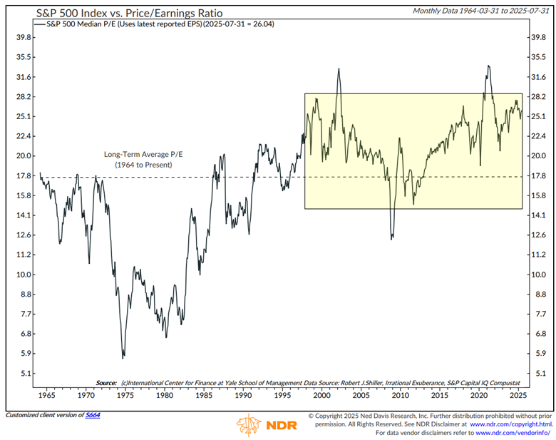 Naturally, current price levels raise the question of valuation. Today, the S&P 500 trades at roughly 26x trailing 12-month earnings compared to a long-term average of 17.8x. These elevated levels are not lost on us, and they remain a critical factor we monitor closely. Yet context matters. As the chart below illustrates, the market has traded above its long-term average for most of the past 25 years.