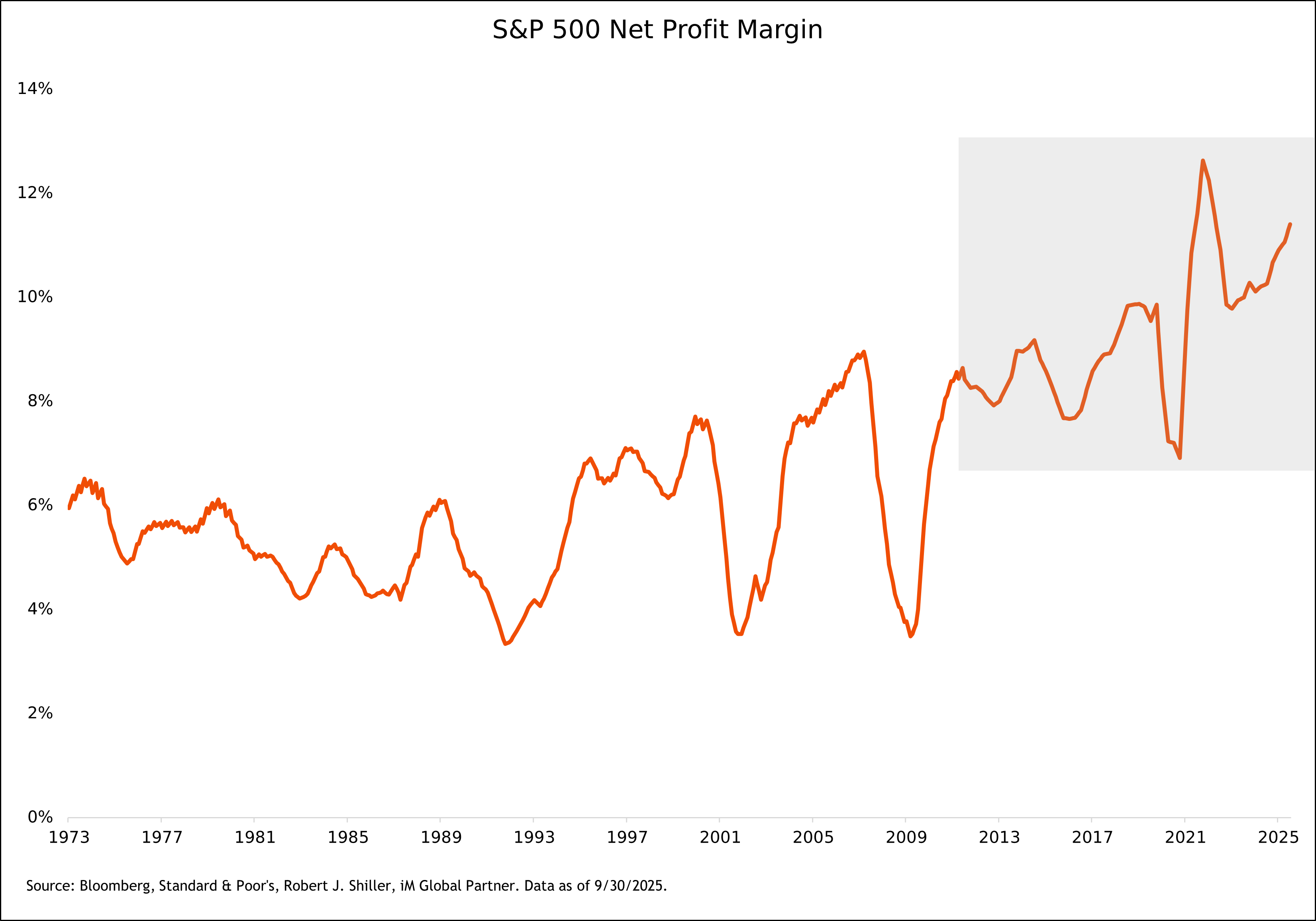 So, what is the “right” multiple? We believe the historical average of 17x is too low for today’s market. A higher fair-value multiple is warranted given structural changes in the economy/ index composition such as the shift away from capital-intensive industries toward asset-light business models, with stronger balance sheets, durable competitive moats, and higher, more resilient profit margins. The chart below shows that since the mid-1990s, margins for the S&P 500 have nearly doubled.